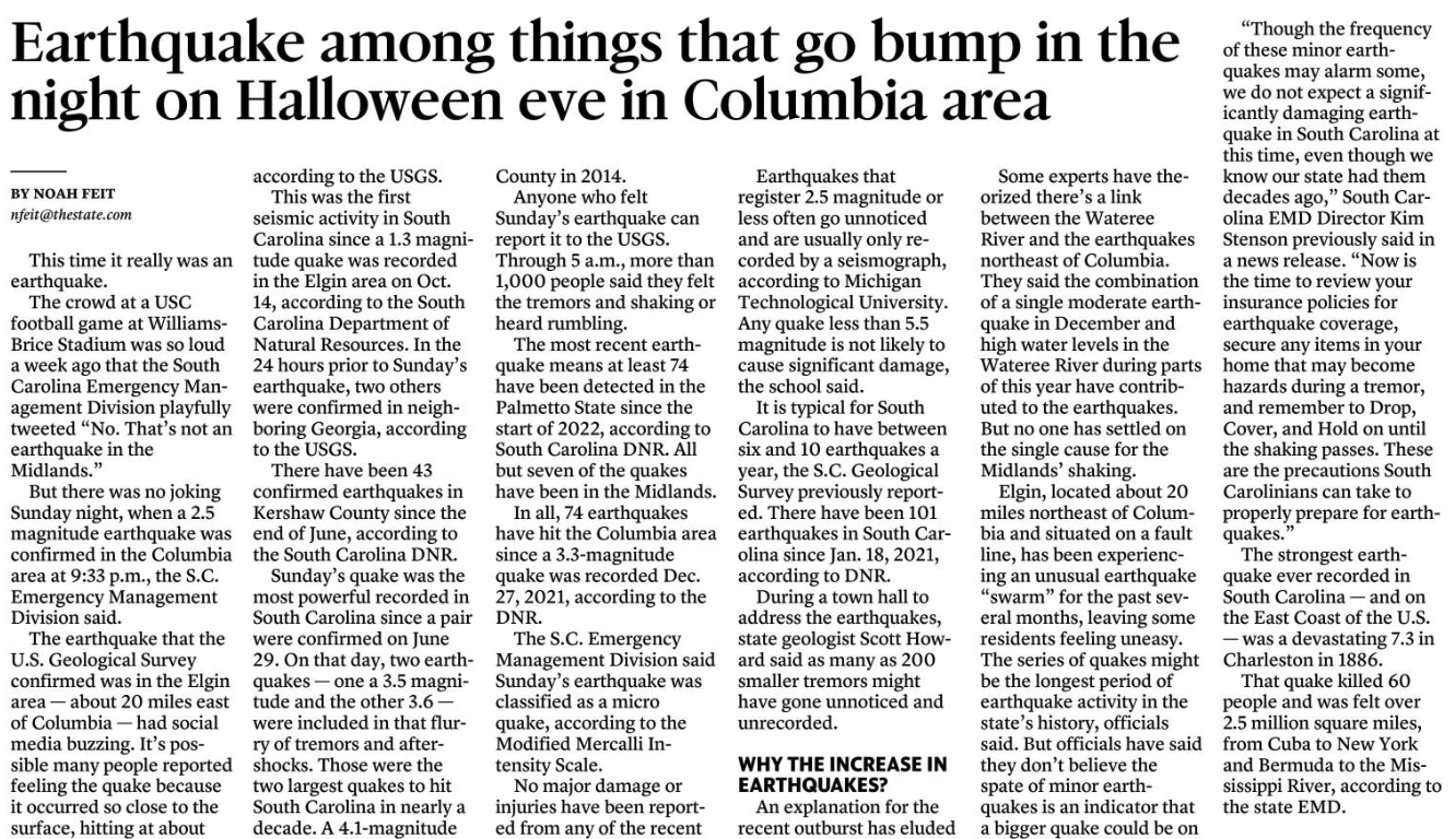 But there was no joking Sunday night, when a 2.5 magnitude earthquake was confirmed in the Columbia area at 9:33 p.m., the S.C. Emergency Management Division said.