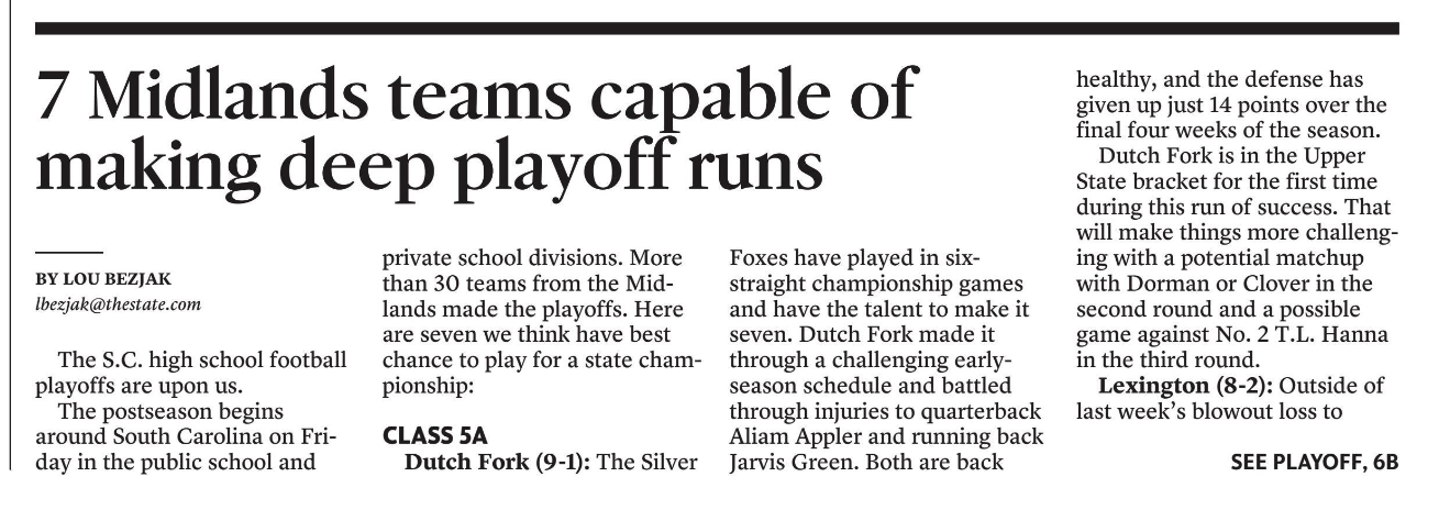The postseason begins around South Carolina on Friday in the public school and private school divisions. More than 30 teams from the Midlands made the playoffs. Here are seven we think have best chance to play for a state championship: