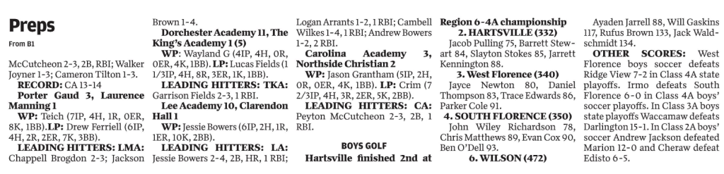 OTHER SCORES:West Florence boys soccer defeats Ridge View 7-2 in Class 4A state playoffs. Irmo defeats South Florence 6-0 in Class 4A boys’ soccer playoffs. In Class 3A boys state playoffs Waccamaw defeats Darlington 15-1. In Class 2Aboys’ soccer Andrew Jackson defeated Marion 12-0 and Cheraw defeat Edisto 6-5.