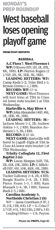 A.C Flora 7, West Florence 1 WP: D Rivers (5IP, 2H, 1R, 1ER, 8K, 3BB). LP: Peyton Rogers (2 1/3IP, 2H, 5R, 3ER, 3K, 3BB).