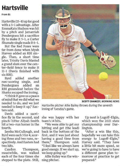 Run-scoring singles by Avarie Easters and Abbey Byrd put Hartsville (15-8) up for good with a 3-1 advantage. After EmmaKate Hudson was hit by a pitch and Jamarriah Pendergrass hit a sacrifice fly to make it 5-1, a Carter Shumate single made it 6-1.