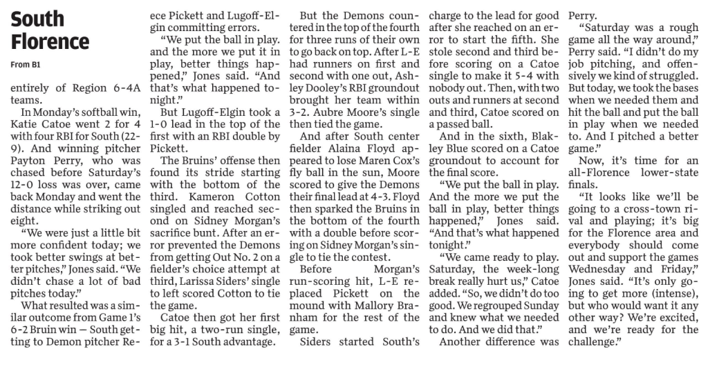 In Monday’s softball win, Katie Catoe went 2 for 4 with four RBI for South (229). And winning pitcher Payton Perry, who was chased before Saturday’s 12-0 loss was over, came back Monday and went the distance while striking out eight.