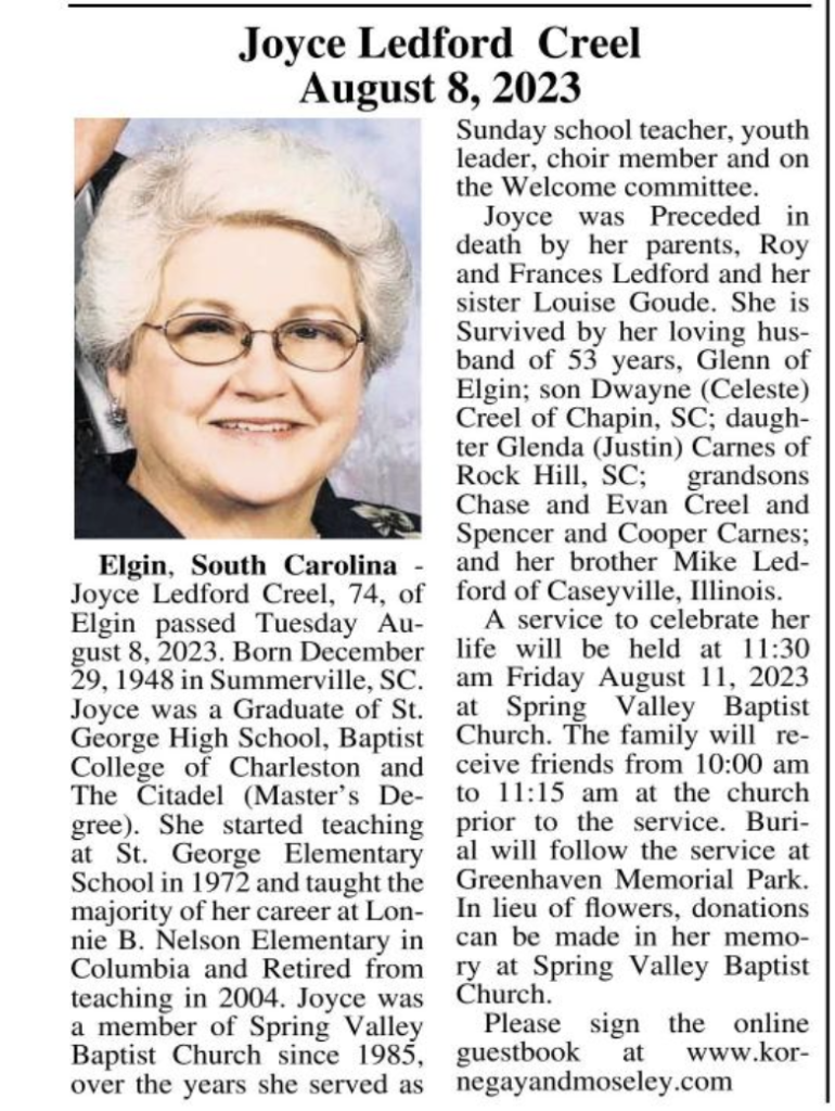Elgin, South Carolina – Joyce Ledford Creel, 74, of Elgin passed Tuesday August 8, 2023. Born December 29, 1948 in Summerville, SC. Joyce was a Graduate of St. George High School, Baptist College of Charleston and The Citadel (Master’s Degree). She started teaching at St. George Elementary School in 1972 and taught the majority of her career at Lonnie B. Nelson Elementary in Columbia and Retired from teaching in 2004. Joyce was a member of Spring Valley Baptist Church since 1985, over the years she served as Sunday school teacher, youth leader, choir member and on the Welcome committee.