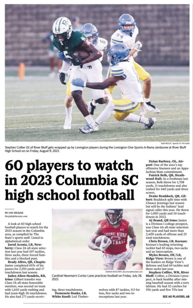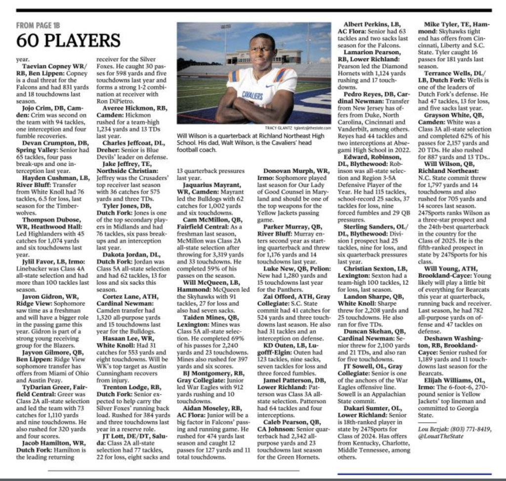 A look at 60 high school football players to watch for the 2023 season in the Columbia area, as compiled by The State’s sports staff. Listed in alphabetical order