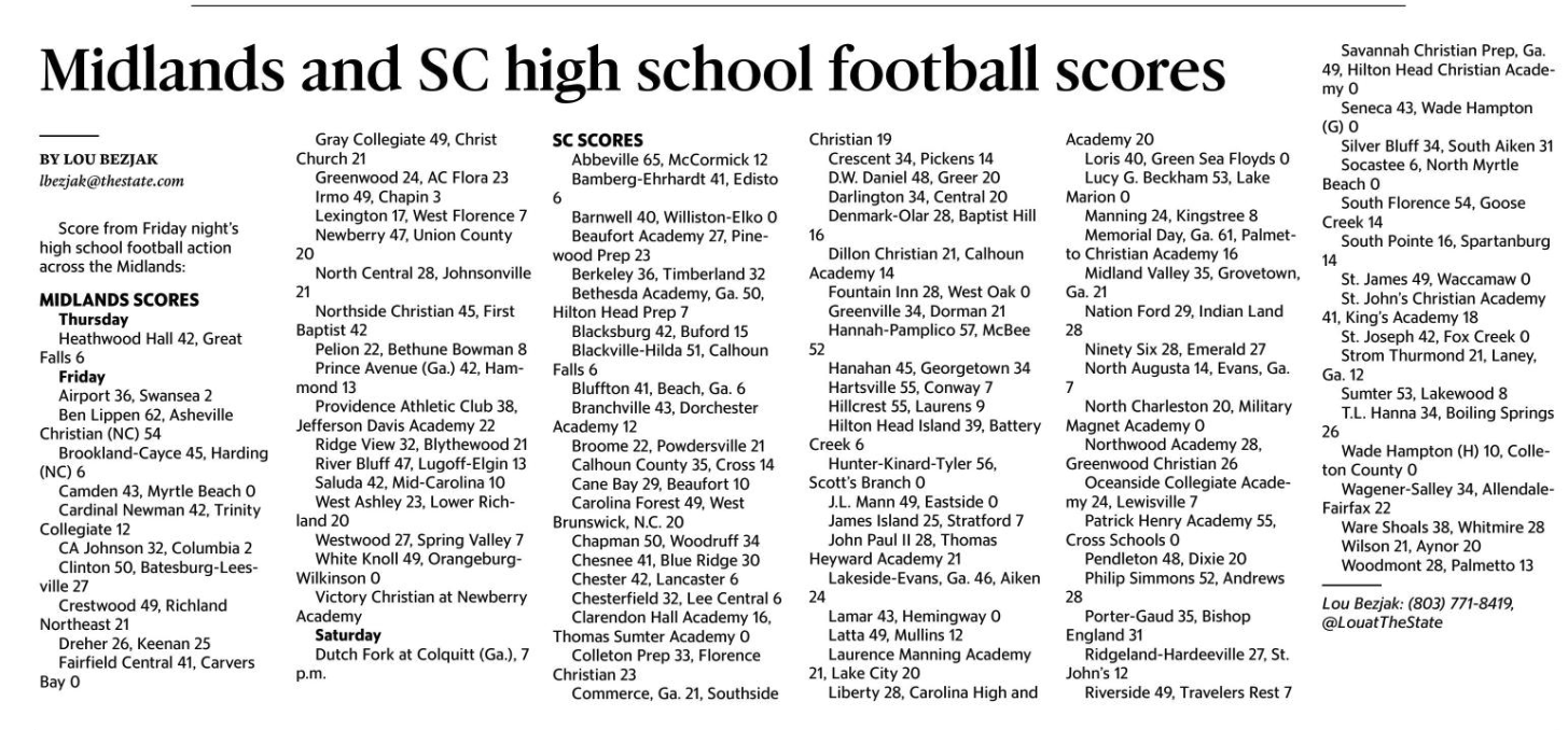 Score from Friday night’s high school football action across the Midlands: