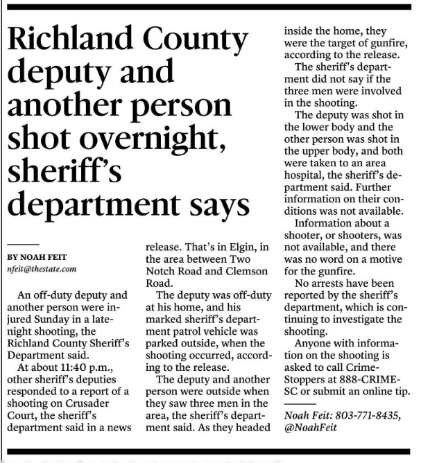 At about 11:40 p.m., other sheriff’s deputies responded to a report of a shooting on Crusader Court, the sheriff’s department said in a news release. That’s in Elgin, in the area between Two Notch Road and Clemson Road.