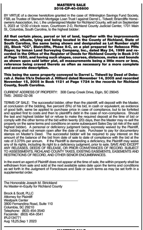 BY VIRTURE of a decree heretofore granted in the case of: Williamgton Savings Fund Society, FSB, as Trustee of Stanwich Mortgage Loan Trust I against Darrel L. Tidwell; Briarcliffe Home owners Association, Inc., I, the undersigned Master for Richland County, will sell on September 5, 2023 at 12:00 o’clock noon, Courtroom 2-D, Richland County Judicial Centery 1701 Main St., Columbia, South Carolina, to the highest bidder: