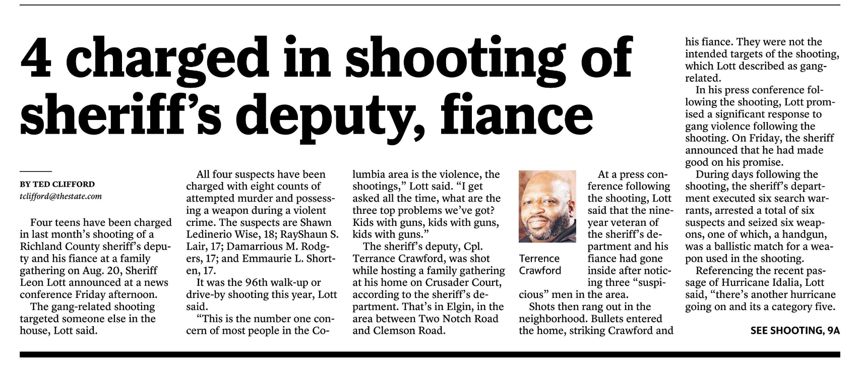 Shots then rang out in the neighborhood. Bullets entered the home, striking Crawford and his fiance. They were not the intended targets of the shooting, which Lott described as gang-related.