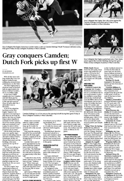 It was Gray’s third straight win over Camden and will likely put the second-ranked War Eagles in the top spot atop the Class 2A polls after No. 1 Abbeville’s loss to Westside.