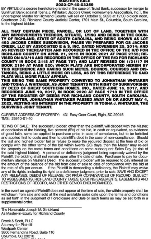BY VIRTUE of a decree heretofore granted in the case of: Truist Bank, successor by merger to SunTrust Bank against Tosha J. Whitaker; Jacob’s Creek Homeowners Association, Inc, I, the undersigned Master for Richland County, will sell on October 2, 2023 at 12:00 o’clock noon, Courtroom 2-D, Richland County Judicial Center, 1701 Main St., Columbia, South Carolina, to the highest bidder: