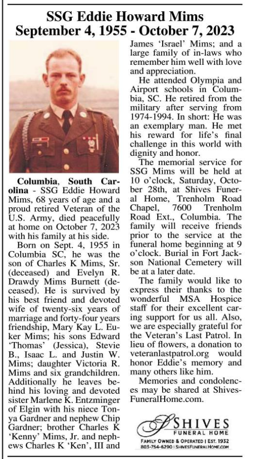 SSG Eddie Howard Mims, 68 years of age and a proud retired Veteran of the U.S. Army, died peacefully at home on Saturday, October 7,2023 with his family at his side.