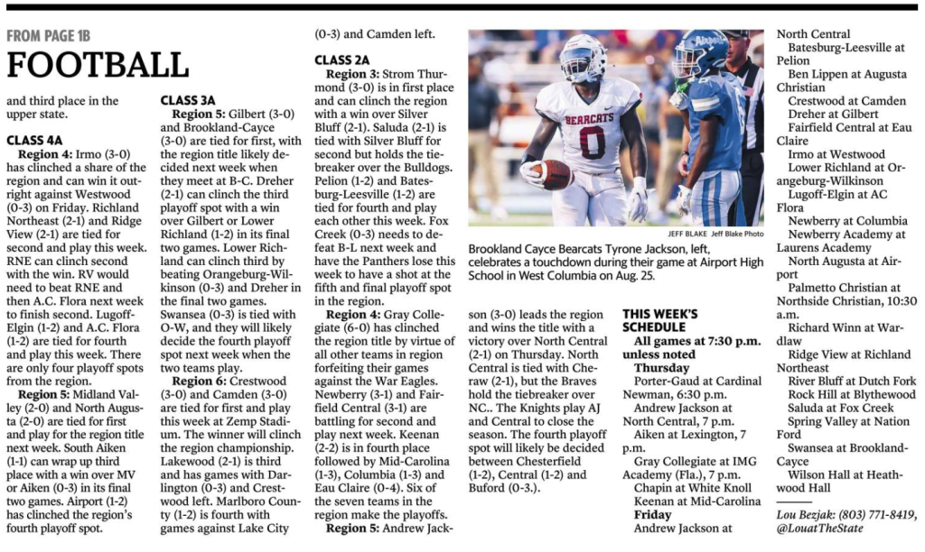 Region 5: Midland Valley (2-0) and North Augusta (2-0) are tied for first and play for the region title next week. South Aiken (1-1) can wrap up third place with a win over MV or Aiken (0-3) in its final two games. Airport (1-2) has clinched the region’s fourth playoff spot.