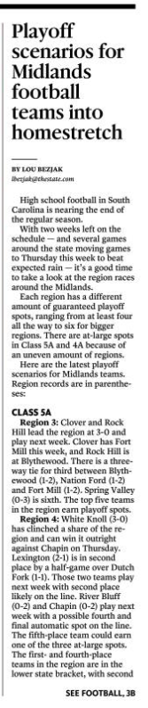 Region 3: Clover and Rock Hill lead the region at 3-0 and play next week. Clover has Fort Mill this week, and Rock Hill is at Blythewood. There is a three-way tie for third between Blythewood (1-2), Nation Ford (1-2) and Fort Mill (1-2). Spring Valley (0-3) is sixth. The top five teams in the region earn playoff spots.