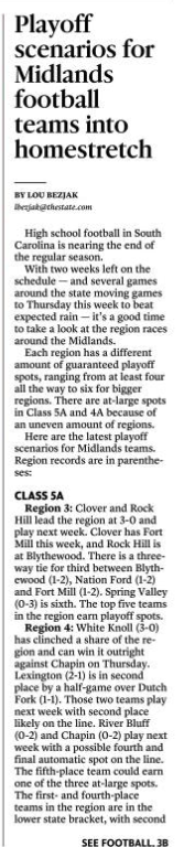 Region 4: White Knoll (3-0) has clinched a share of the region and can win it outright against Chapin on Thursday. Lexington (2-1) is in second place by a half-game over Dutch Fork (1-1). Those two teams play next week with second place likely on the line. River Bluff (0-2) and Chapin (0-2) play next week with a possible fourth and final automatic spot on the line. The fifth-place team could earn one of the three at-large spots. The first- and fourth-place teams in the region are in the lower state bracket, with second and third place in the upper state.