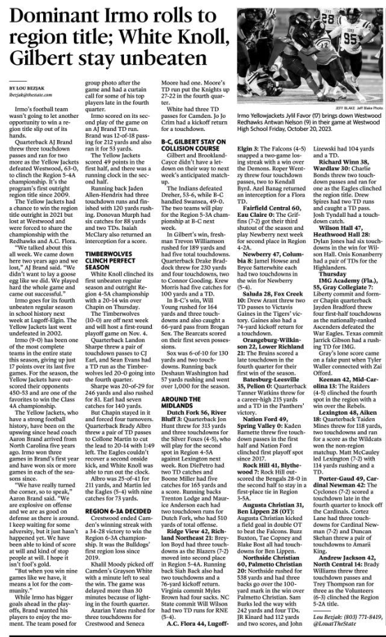 Fairfield Central 60, Eau Claire 0: The Griffins (7-2) got their third shutout of the season and play Newberry next week for second place in Region 4-2A.