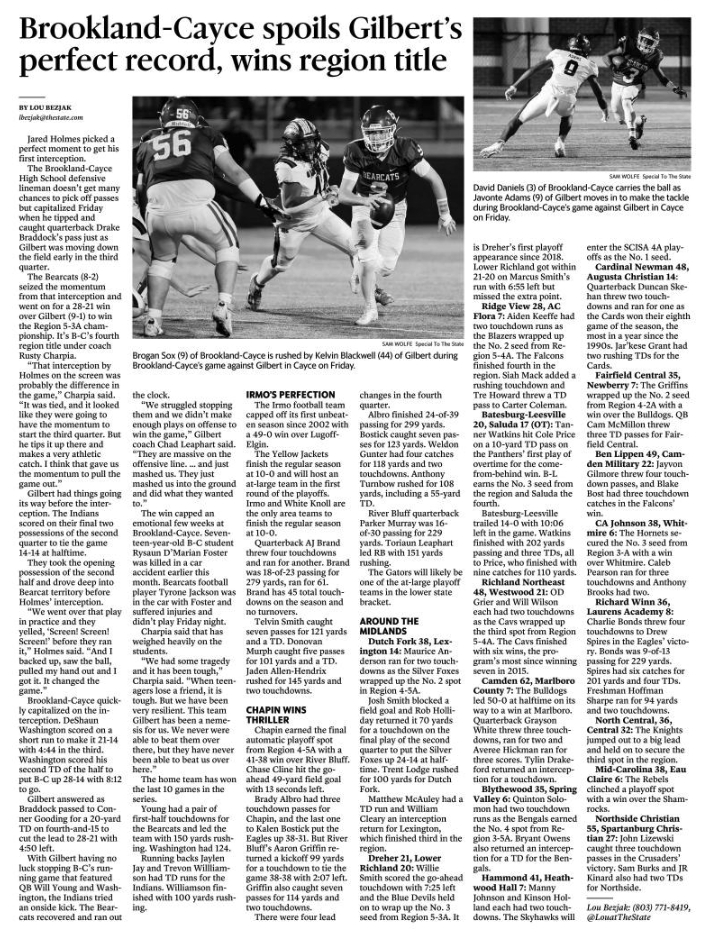 Blythewood 35, Spring Valley 6: Quinton Solomon had two touchdown runs as the Bengals earned the No. 4 spot from Region 3-5A. Bryant Owens also returned an interception for a TD for the Bengals.