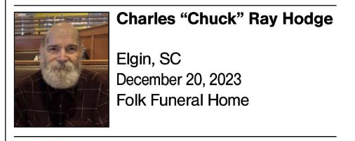Funeral services for Charles “Chuck” Ray Hodge, 74, of Elgin, SC will be held at one o’clock p.m., Saturday, December 30, 2023 in the Folk Funeral Home Chapel, Williston, SC with burial in the Mt. Calvary Baptist Church Cemetery, Blackville, SC. The family will receive friends one hour prior to the service at the funeral home on Saturday. Chuck passed away on Wednesday, December 20, 2023.