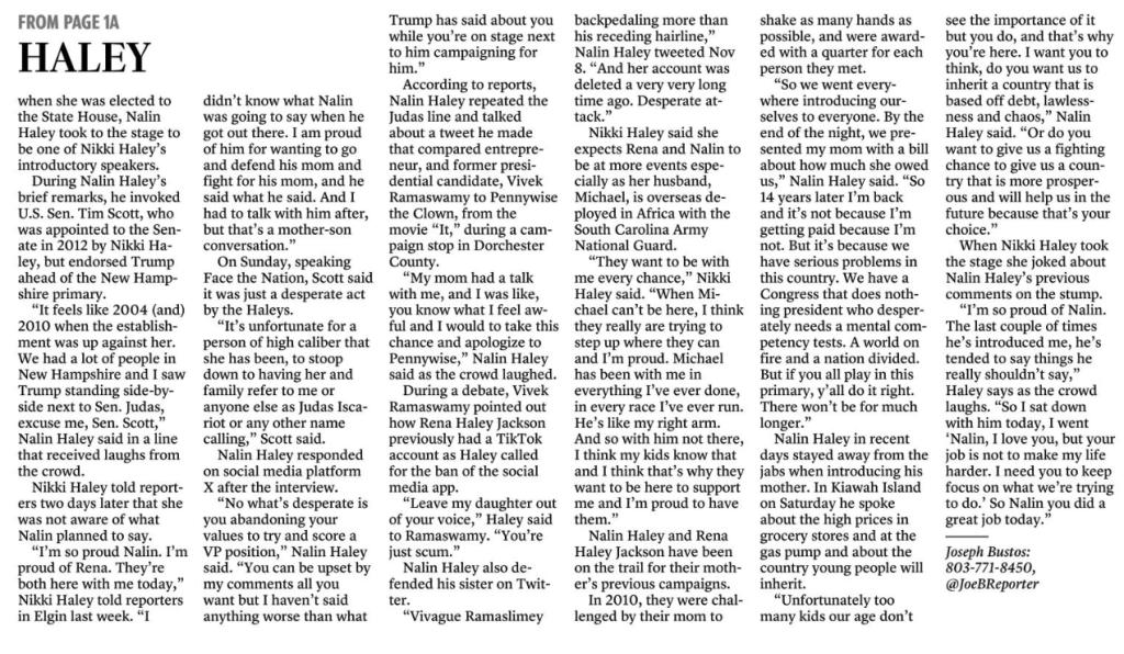 On Feb. 10, when Haley’s campaign bus tour returned to the area Haley first represented when she was elected to the State House, Nalin Haley took to the stage to be one of Nikki Haley’s introductory speakers.