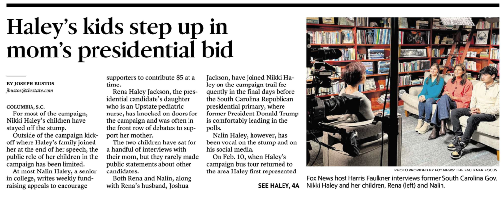 “They want to be with me every chance,” Nikki Haley said. “When Michael can’t be here, I think they really are trying to step up where they can and I’m proud. Michael has been with me in everything I’ve ever done, in every race I’ve ever run. He’s like my right arm. And so with him not there, I think my kids know that and I think that’s why they want to be here to support me and I’m proud to have them.”