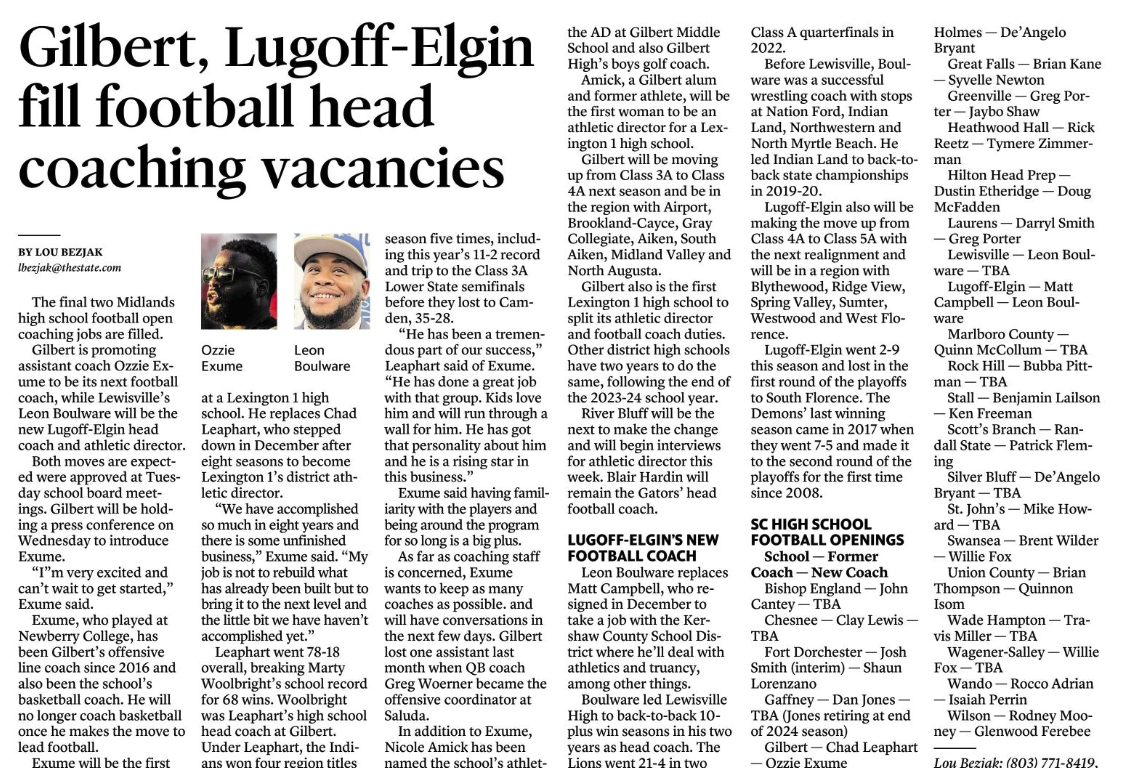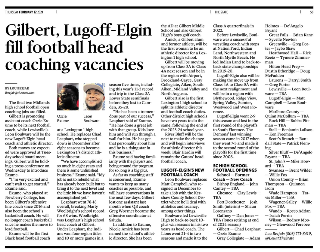 Gilbert is promoting assistant coach Ozzie Exume to be its next football coach, while Lewisville’s Leon Boulware will be the new Lugoff-Elgin head coach and athletic director.