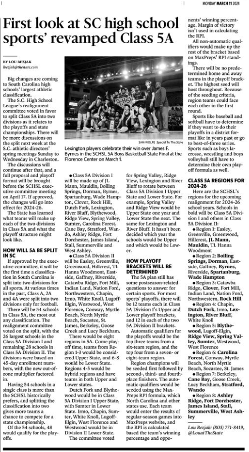 * Class 5A Division I will be made up of JL Mann, Mauldin, Boiling Springs, Dorman, Byrnes, Spartanburg, Wade Hampton, Clover, Rock Hill, Dutch Fork, Lexington, River Bluff, Blythewood, Ridge View, Spring Valley, Sumter, Carolina Forest, Cane Bay, Stratford, Wando, Ashley Ridge, Fort Dorchester, James Island, Stall, Summerville and West Ashley.