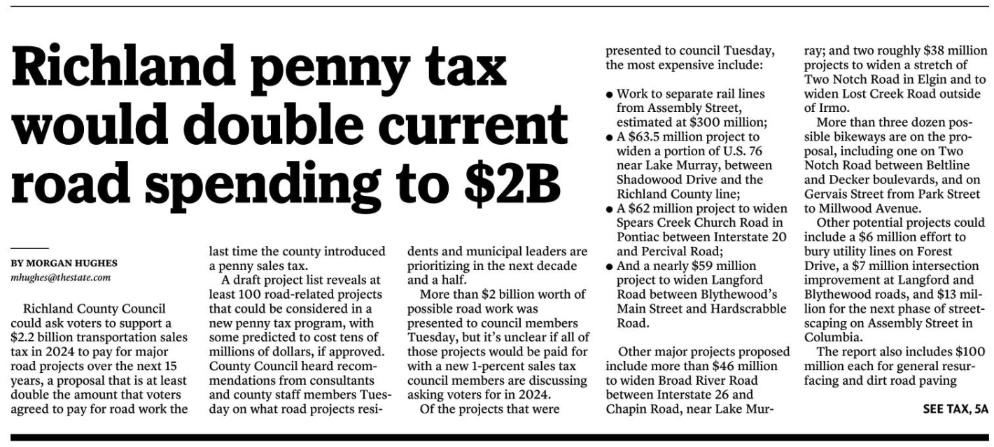 Richland County Council could ask voters to support a $2.2 billion transportation sales tax in 2024 to pay for major road projects over the next 15 years, a proposal that is at least double the amount that voters agreed to pay for road work the last time the county introduced a penny sales tax.