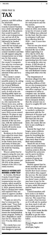 Councilman Don Weaver, who represents the Forest Acres area, said he would like to see the more than $2 billion the new tax would generate divided more fairly across council districts. He plans to suggest that each district be allotted a minimum amount of the tax revenue, with the understanding that some districts would still receive more than the minimum amount.