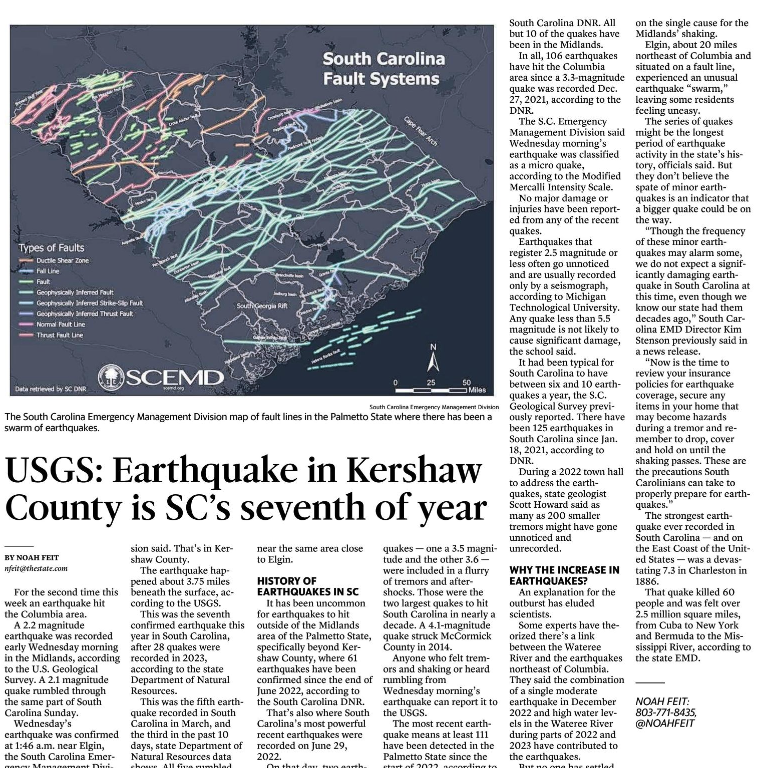 Elgin, about 20 miles northeast of Columbia and situated on a fault line, experienced an unusual earthquake “swarm,” leaving some residents feeling uneasy.