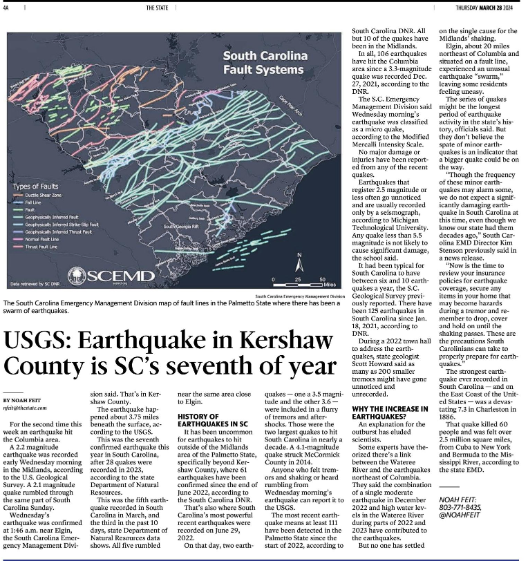 On that day, two earthquakes – one a 3.5 magnitude and the other 3.6 – were included in a flurry of tremors and aftershocks. Those were the two largest quakes to hit South Carolina in nearly a decade. A 4.1-magnitude quake struck McCormick County in 2014.