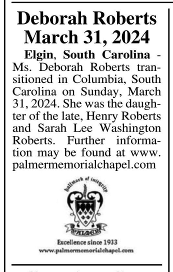 Elgin, South Carolina – Ms. Deborah Roberts transitioned in Columbia, South Carolina on Sunday, March 31, 2024. She was the daughter of the late, Henry Roberts and Sarah Lee Washington Roberts. Further information may be found at www.palmermemorialchapel.com
