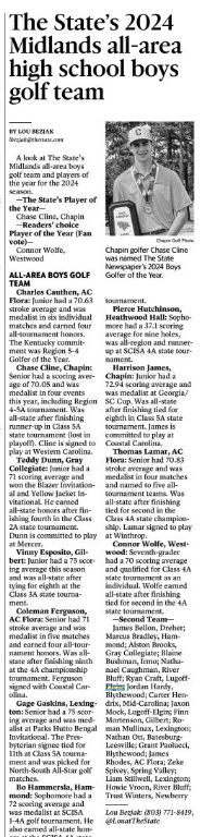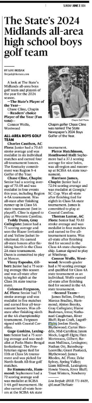 Chase Cline, Chapin: Senior had a scoring average of 70.05 and was medalist in four events this year, including Region 4-5A tournament. Was all-state after finishing runner-up in Class 5A state tournament (lost in playoff). Cline is signed to play at Western Carolina.