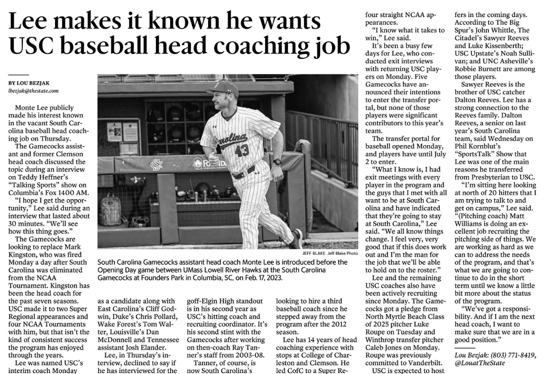 Lee, in Thursday’s interview, declined to say if he has interviewed for the job yet. The former Lugoff-Elgin High standout is in his second year as USC’s hitting coach and recruiting coordinator. It’s his second stint with the Gamecocks after working on then-coach Ray Tanner’s staff from 2003-08.