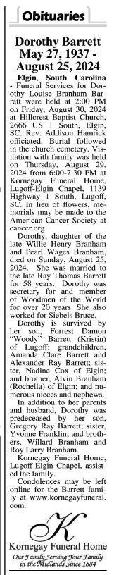 Funeral Services for Dorothy Louise Branham Barrett will be held at 2:00 PM on Friday, August 30, 2024 at Hillcrest Baptist Church, 2666 US 1 South, Elgin, SC. Rev. Addison Hamrick will officiate.  Burial will follow in the church cemetery. Visitation with family will be held on Thursday, August 29, 2024 from 6:00-7:30 PM at Kornegay Funeral Home, Lugoff-Elgin Chapel, 1139 Highway 1 South, Lugoff, SC. In lieu of flowers, memorials may be made to the American Cancer Society at cancer.org.