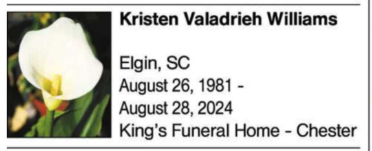 She died on 28 Aug 2024 in Elgin, Kershaw, South Carolina, USA at 57 Danali Circle. Kristen Valadrieh Williams was buried on 06 Sep 2024 in Chester, South Carolina, USA at Cedar Grove Baptist Church.