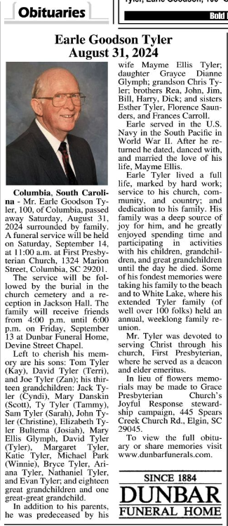 COLUMBIA – Mr. Earle Goodson Tyler, 100, of Columbia, passed away Saturday, August 31, 2024 surrounded by family. A funeral service will be held on Saturday, September 14, at 11:00 a.m. at First Presbyterian Church, 1324 Marion Street, Columbia, SC 29201.