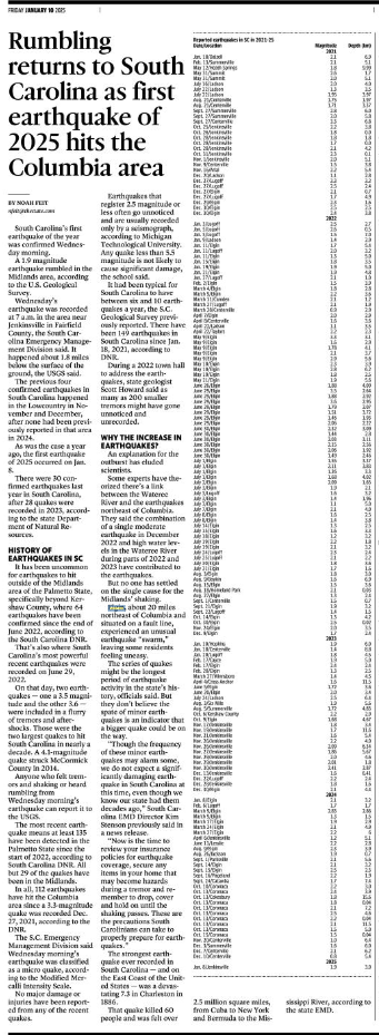 Reported earthquakes in SC in 2021-25Date/Location Magnitude Depth (km)