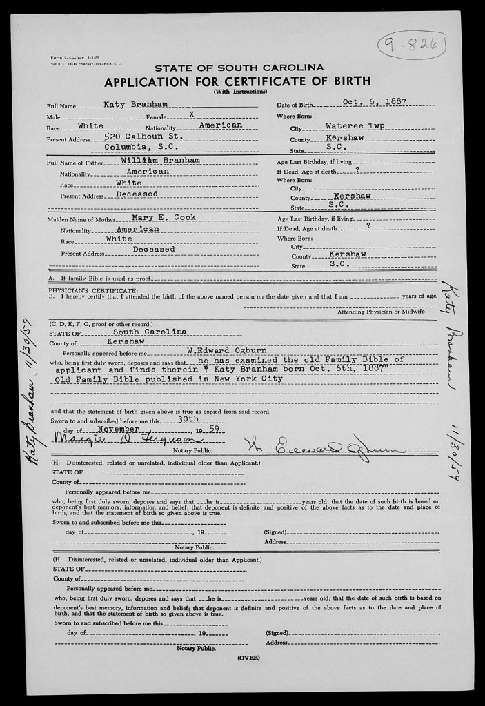 Katie Branham was born on 06 Oct 1887 in Kershaw, South Carolina, USA a child of William Madison Branham and Mary Cook Branham.