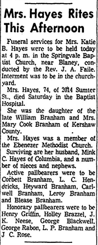 Funeral services for Mrs. Katie B. Hayes were to be held today at 4 p. m. in the Springvale Baptist Church, near Blaney, conducted by the Rev. J. A. Faile. Interment was to be in the churchyard.