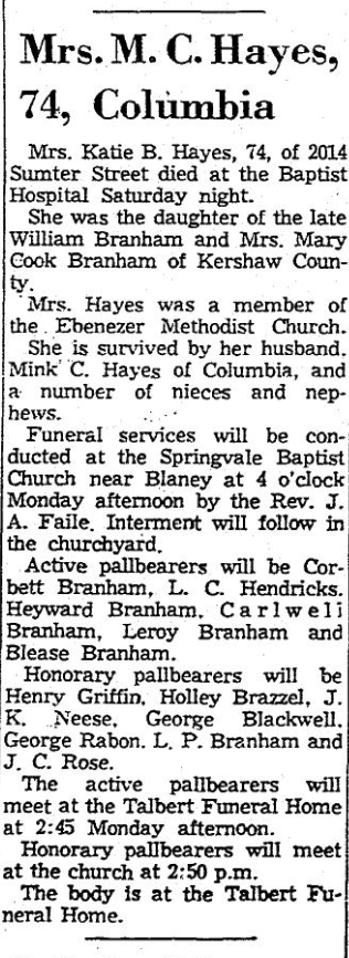 Surviving are her husband, Mink C. Hayes of Columbia, and a number of nieces and nephews.