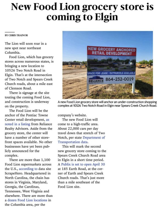 Food Lion, which has grocery stores across numerous states, is bringing a new location to 10526 Two Notch Road in Elgin . That’s at the intersection of Two Notch and Spears Creek Church roads, about a mile east of Clemson Road .