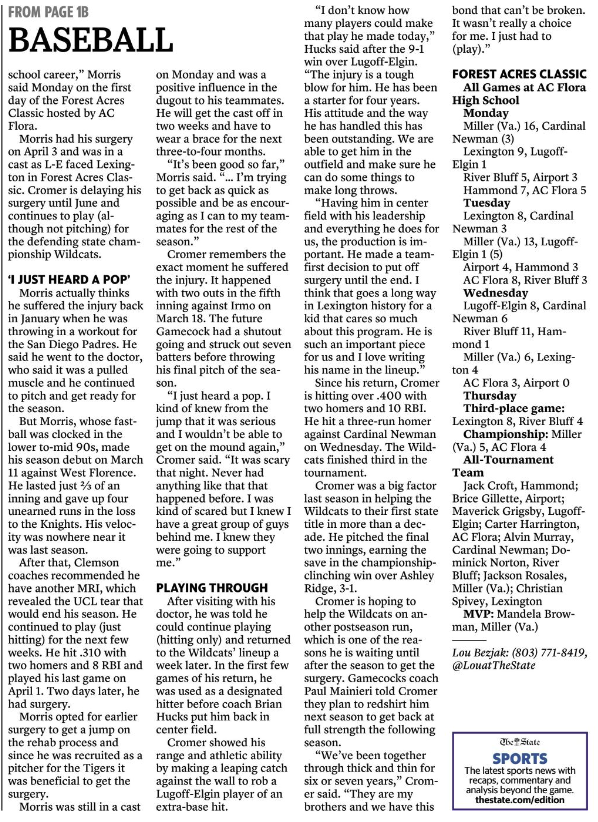 Morris had his surgery on April 3 and was in a cast as L-E faced Lexington in Forest Acres Classic. Cromer is delaying his surgery until June and continues to play (although not pitching) for the defending state championship Wildcats.