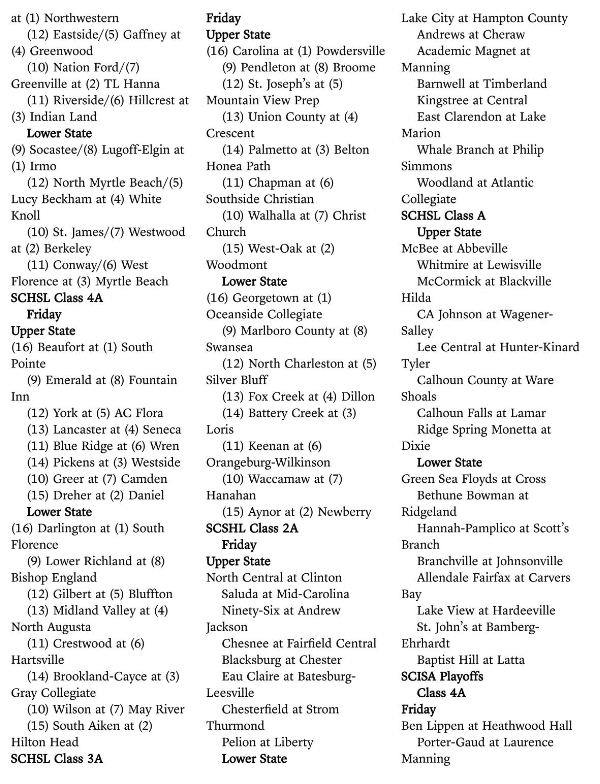 Here is a look at the SCHSL football playoff matchups for the postseason. Official brackets will be released Saturday morning.