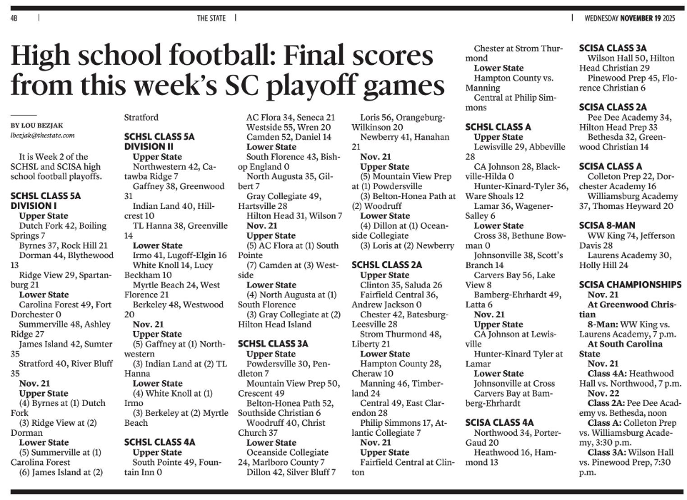 It is Week 2 of the SCHSL and SCISA high school football playoffs.
