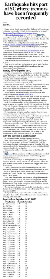 Prior to Friday’s tremors, the most recent earthquake in the Palmetto State occurred a week earlier on Nov. 21, when a 1.93 magnitude quake was confirmed near Ladson, South Carolina Department of Natural Resources Geological Survey data shows. That is in South Carolina’s Lowcountry.