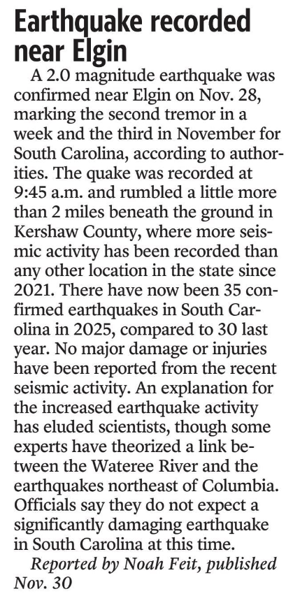 A 2.0 magnitude earthquake was confirmed near Elgin on Nov. 28, marking the second tremor in a week and the third in November for South Carolina, according to authorities. The quake was recorded at 9:45 a.m. and rumbled a little more than 2 miles beneath the ground in Kershaw County, where more seismic activity has been recorded than any other location in the state since 2021. There have now been 35 confirmed earthquakes in South Carolina in 2025, compared to 30 last year. No major damage or injuries have been reported from the recent seismic activity. An explanation for the increased earthquake activity has eluded scientists, though some experts have theorized a link between the Wateree River and the earthquakes northeast of Columbia. Officials say they do not expect a significantly damaging earthquake in South Carolina at this time.