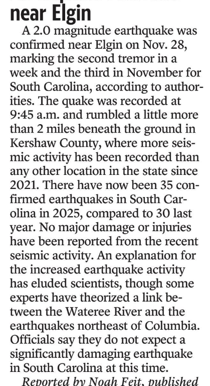A 2.0 magnitude earthquake was confirmed near Elgin on Nov. 28, marking the second tremor in a week and the third in November for South Carolina, according to authorities. The quake was recorded at 9:45 a.m. and rumbled a little more than 2 miles beneath the ground in Kershaw County, where more seismic activity has been recorded than any other location in the state since 2021. There have now been 35 confirmed earthquakes in South Carolina in 2025, compared to 30 last year. No major damage or injuries have been reported from the recent seismic activity. An explanation for the increased earthquake activity has eluded scientists, though some experts have theorized a link between the Wateree River and the earthquakes northeast of Columbia. Officials say they do not expect a significantly damaging earthquake in South Carolina at this time.