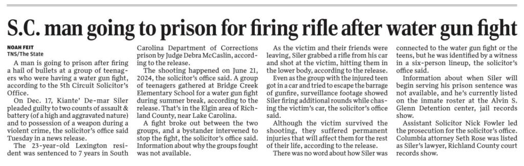 The shooting happened on June 21, 2024, the solicitor’s office said. A group of teenagers gathered at Bridge Creek Elementary School for a water gun fight during summer break, according to the release. That’s in the Elgin area of Richland County, near Lake Carolina.