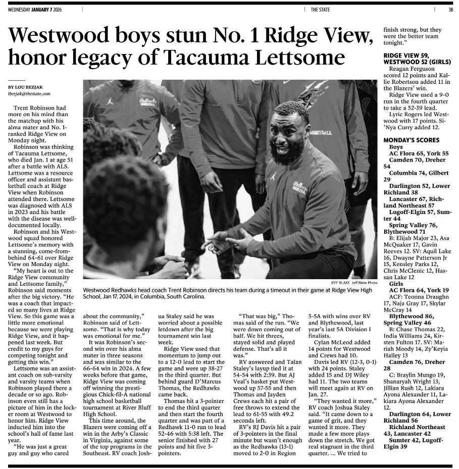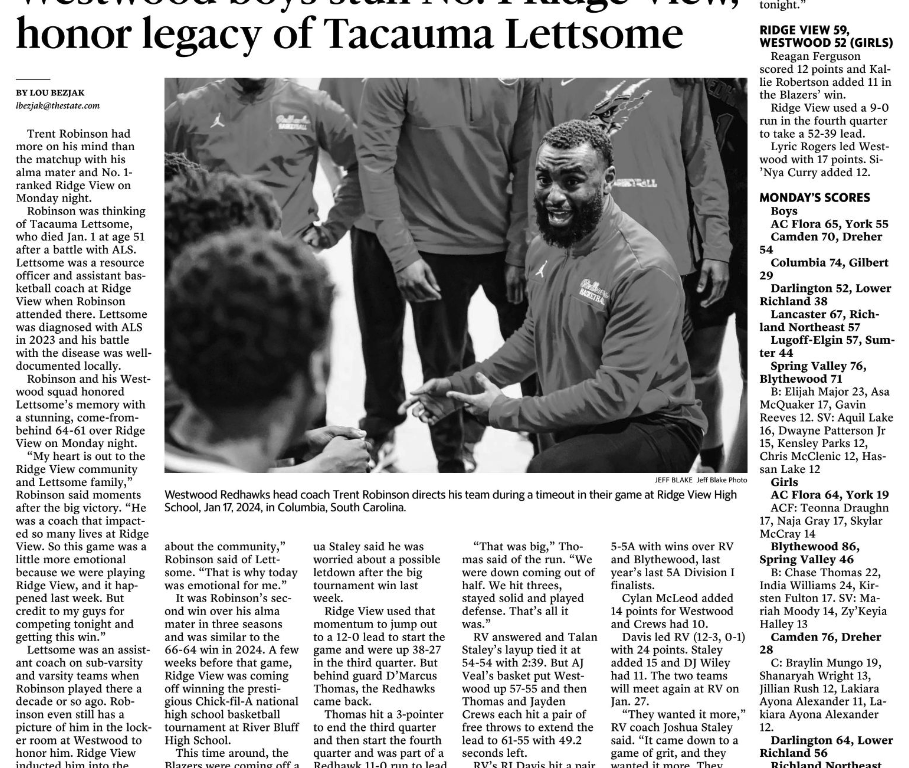 Robinson and his Westwood squad honored Lettsome’s memory with a stunning, come-from-behind 64-61 over Ridge View on Monday night.