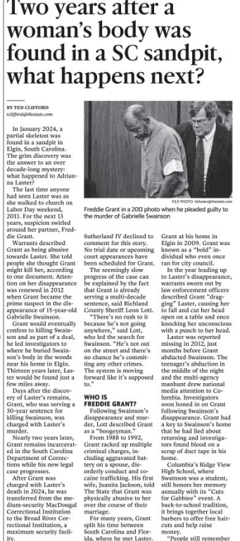 Days after the discovery of Laster’s remains, Grant, who was serving a 30-year sentence for killing Swainson, was charged with Laster’s murder.