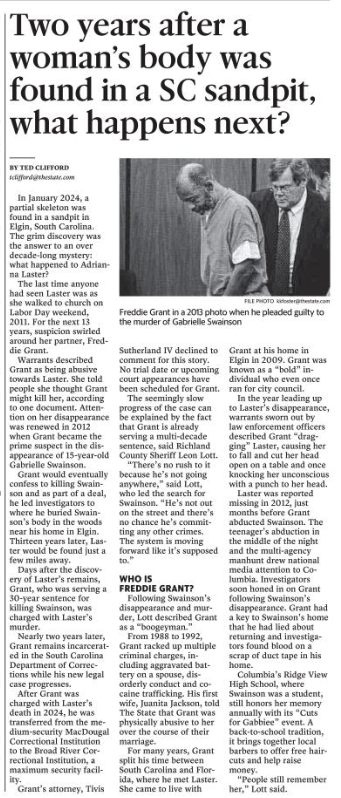 Laster was reported missing in 2012, just months before Grant abducted Swainson. The teenager’s abduction in the middle of the night and the multi-agency manhunt drew national media attention to Columbia. Investigators soon honed in on Grant following Swainson’s disappearance. Grant had a key to Swainson’s home that he had lied about returning and investigators found blood on a scrap of duct tape in his home.